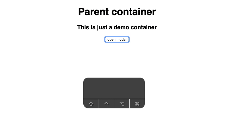 1/* src/App.re*/234[%bs.raw {|require('./App.css')|}];56[@react.component]7let make = () => {8 let (isModalVisible, setIsModalVisible) = React.useState(() => false);910 <div className="App">11 <h1> {"Parent container" |> ReasonReact.string} </h1>12 <h3> {"This is just a demo container" |> ReasonReact.string} </h3>13 <button onClick={_ => setIsModalVisible(_ => !isModalVisible)}>14 {"open modal" |> ReasonReact.string}15 </button>16 {!isModalVisible17 ? ReasonReact.null18 : <Modal onModalClose={() => setIsModalVisible(_ => false)}>19 <Modal.Header> {"Header" |> ReasonReact.string} </Modal.Header>20 <Modal.Body> {"Body" |> ReasonReact.string} </Modal.Body>21 <Modal.Footer>22 <Modal.Footer.CloseBtn>23 {"Close" |> ReasonReact.string}24 </Modal.Footer.CloseBtn>25 </Modal.Footer>26 </Modal>}27 </div>;28};