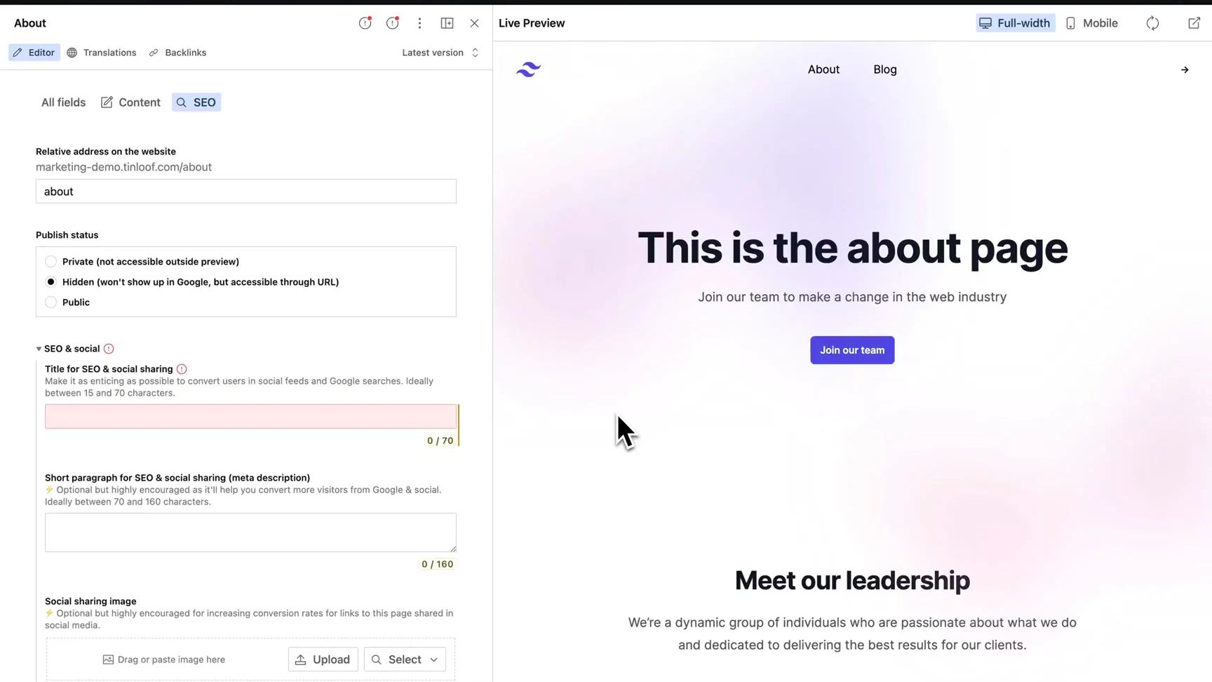 We also provide marketers with complete control over the pages' SEO fields (e.g. title, description) and validate them based on Google's best practices.